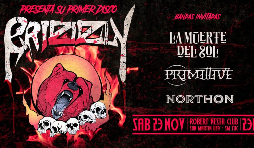 Con el motivo de festejar la salida de su primer material discográfico, Grizzly se presentara en el Robert Nesta (San Martin 219) este sábado 23 de Noviembre junto a tres grandes exponentes de la escena tucumana, La Muerte Del Sol (quien hace muy poco lanzo su primer disco en forma virtual), Northon (el nuevo proyecto de Tunkila Marin, John Parra, el Flaco Ahumada y Ariel Bellos) y los thrasheros Primittive (que vienen laburando lo que sera su primera placa).